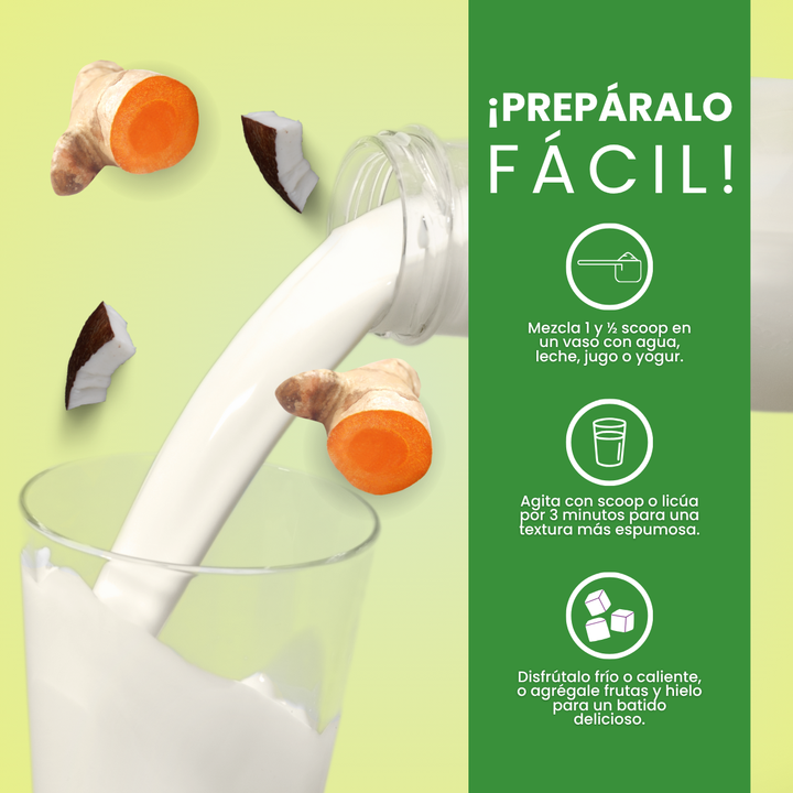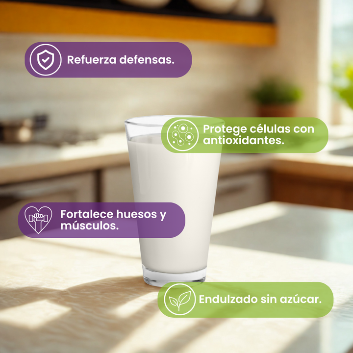 Delicioso complemento nutricional en polvo que combina proteína de suero lácteo, fosfato tricálcico (calcio), magnesio, vitaminas C, E y del complejo B, extracto de cúrcuma y fibra (carboximetilcelulosa) para apoyar tu bienestar diario .
