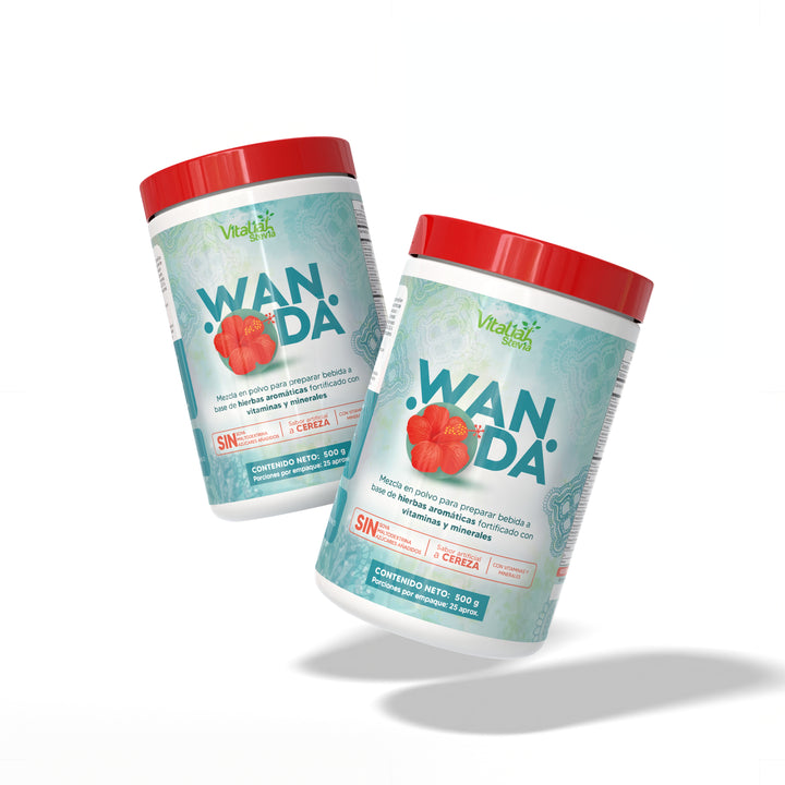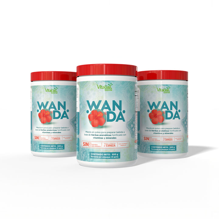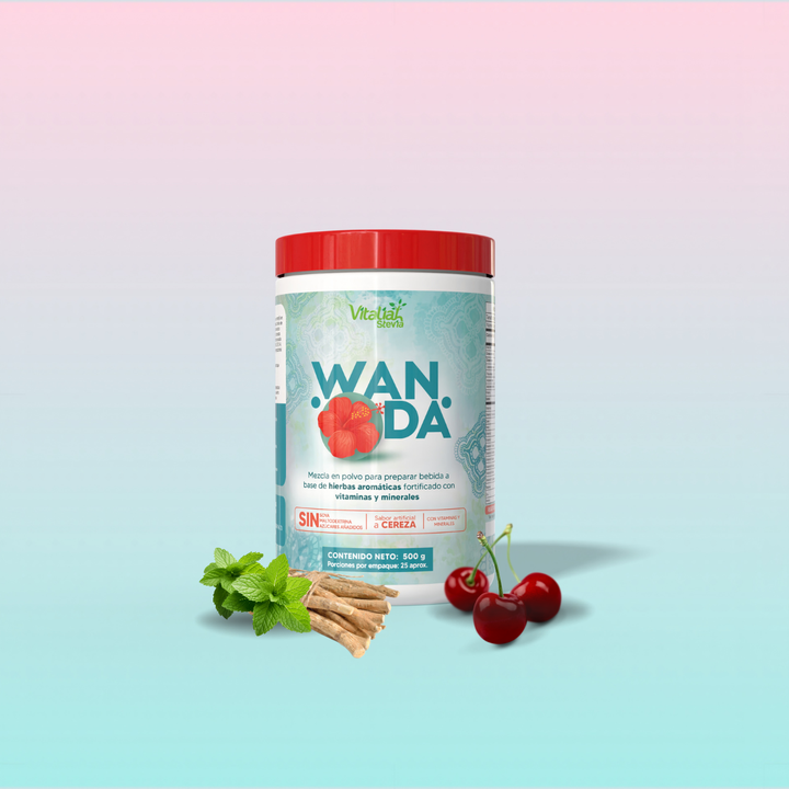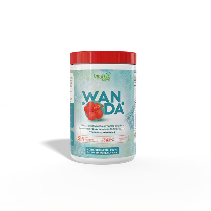 WANDA es una mezcla en polvo a base de hierbas aromáticas y flor de Jamaica, fortificada con vitaminas y minerales. Ideal para preparar una bebida natural, refrescante y nutritiva con sabor a cereza.