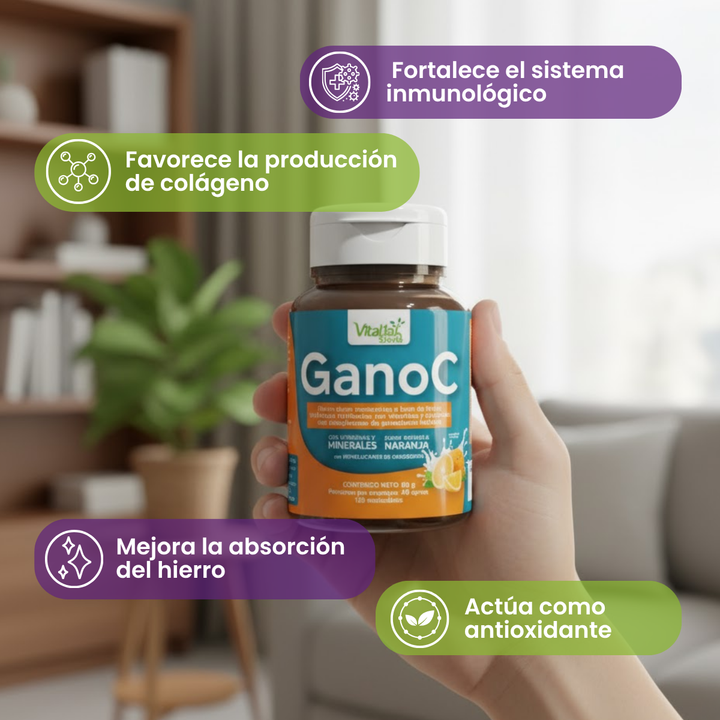 La combinación de vitamina C y Ganoderma lucidum fortalece el sistema inmunológico, actúa como antioxidante, reduce la inflamación, mejora la circulación y ayuda a mantener la energía y la salud general del organismo.