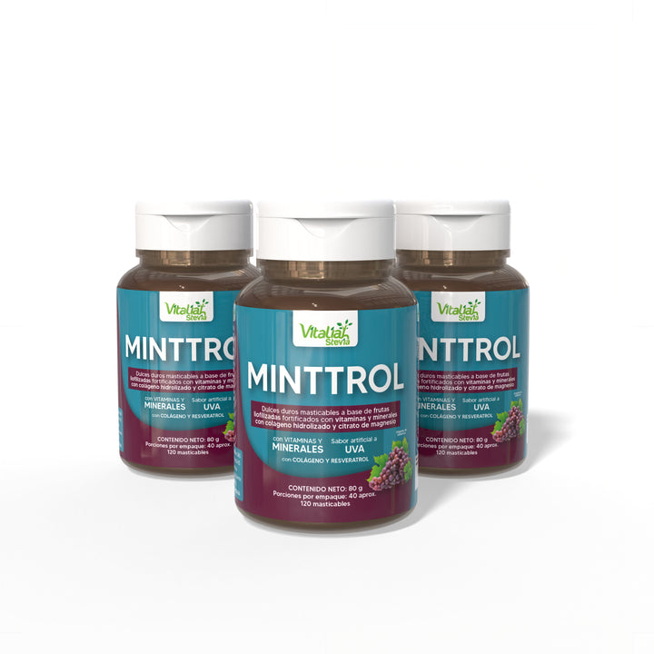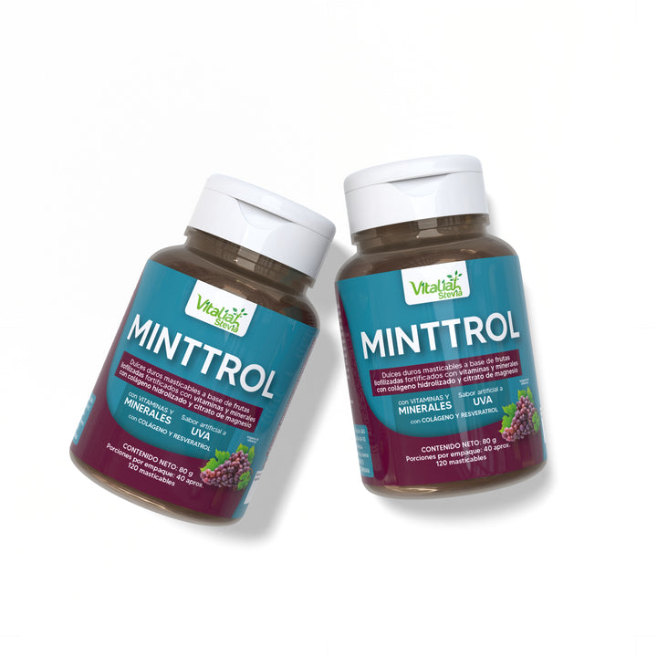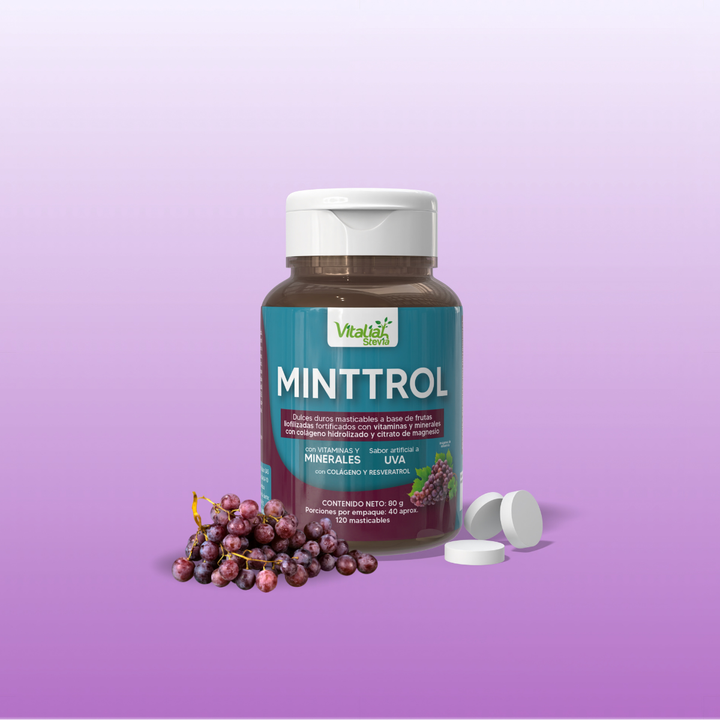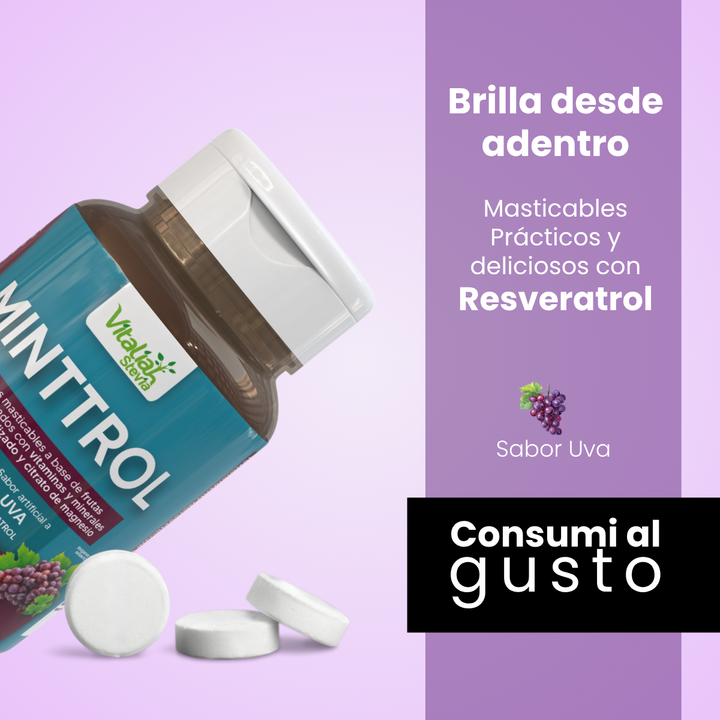 Frutas liofilizadas, menta, uva liofilizada, colágeno hidrolizado (100 mg por porción), resveratrol (50 mg por porción)
